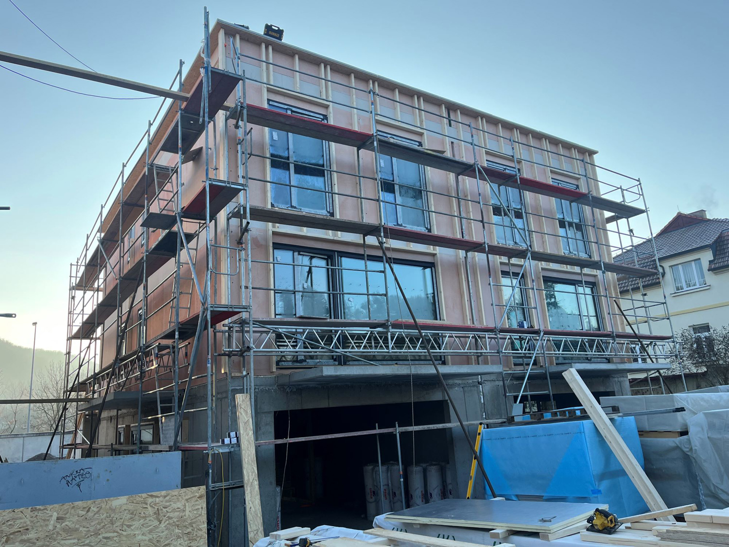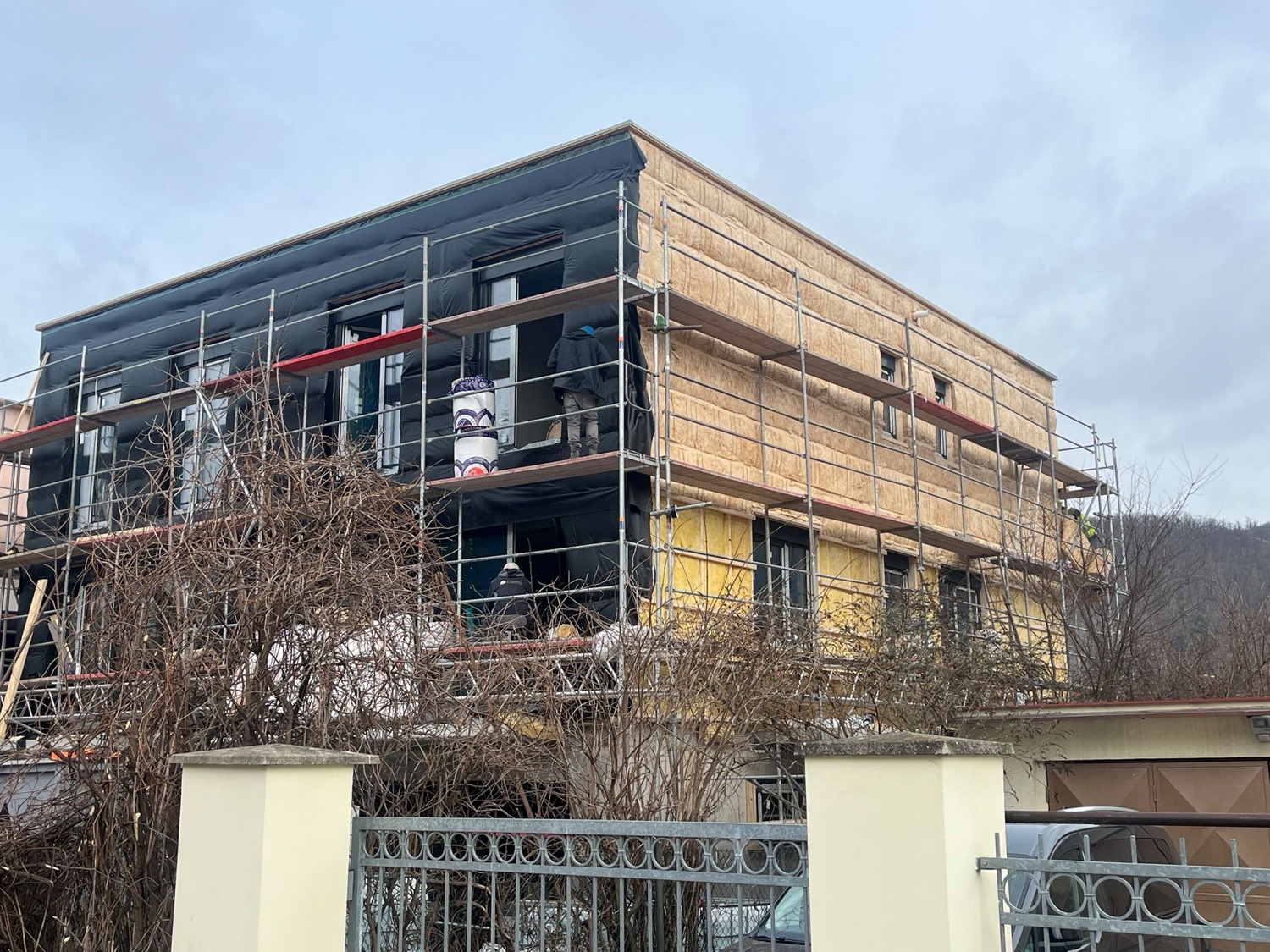 konstrukci na bázi dřevostavby od společnosti VEXTA a.s.. Dřevěná konstrukce je ze strany interiéru opláštěna sádrovláknitými deskami fermacell®. Ze strany exteriéru je na nosné konstrukci upevněný křížový dřevěný rošt, tepelnou izolací je minerální vata. Vše je zakryto pojistnou hydoizolační folií, odolnou proti UV záření. Následně jsou namontovány svislé podkladní rošty z KVH hranolů, EPDM páska a vláknocementové fasádní obklady Hardie® Panel v antracitově šedé barvě. Desky jsou šroubovány vruty s barvenou hlavičkou. Vzhled domu pak dokonale dotváří modřínové obklady.