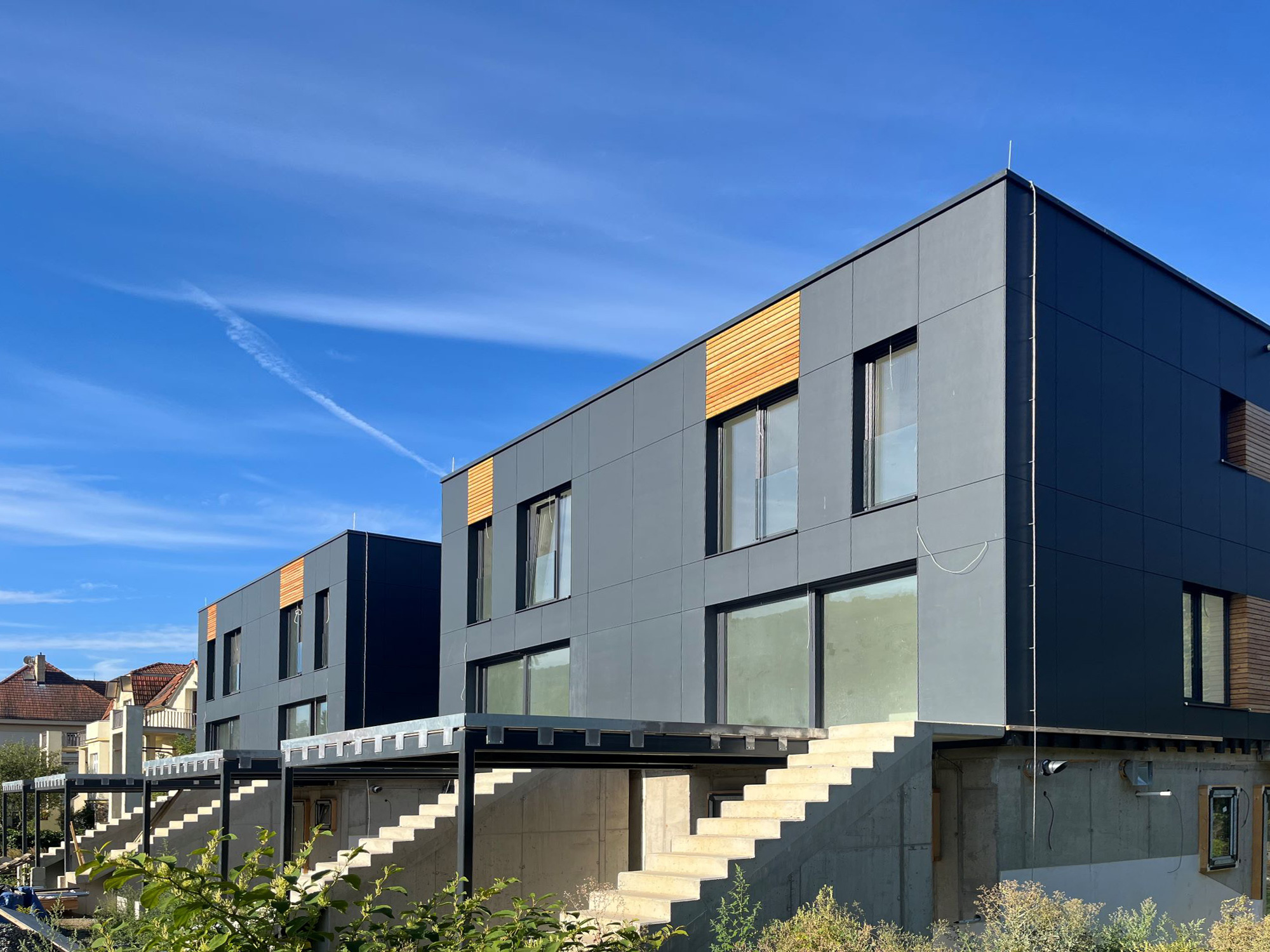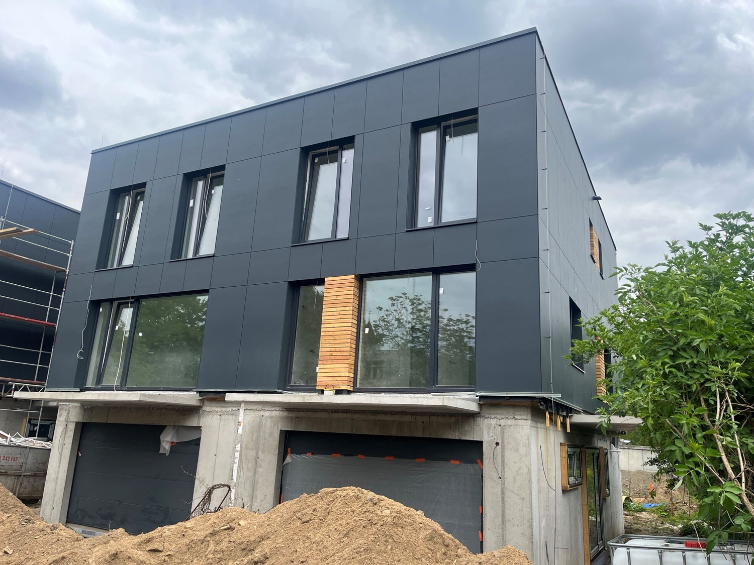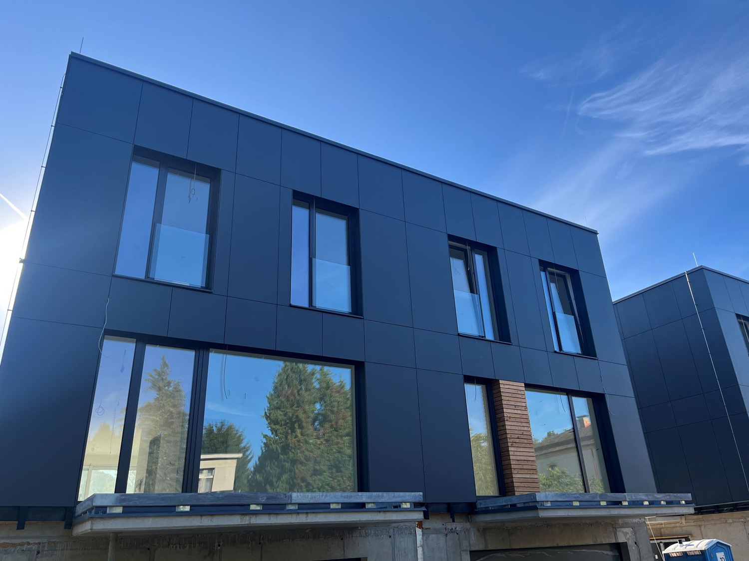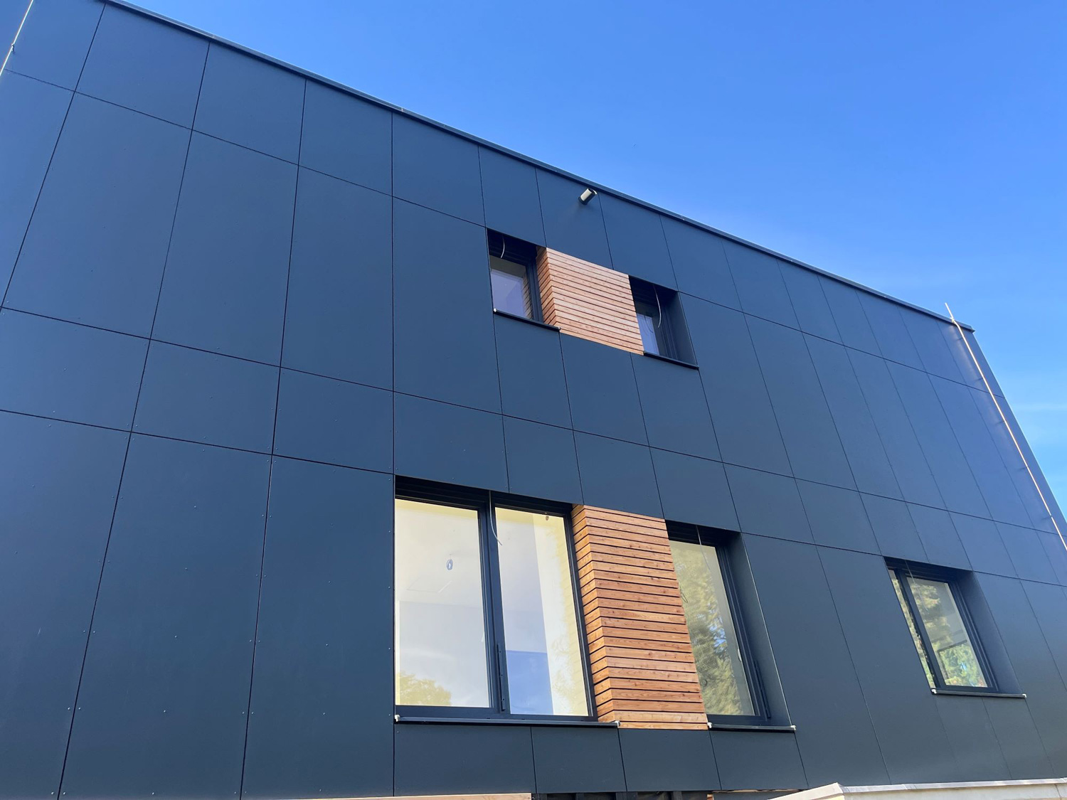 Vláknocementové panely Hardie® Panel v odstínu antracitově šedá tvoří základní plochy fasády. Jejich hladký povrch a přesné spáry podtrhují