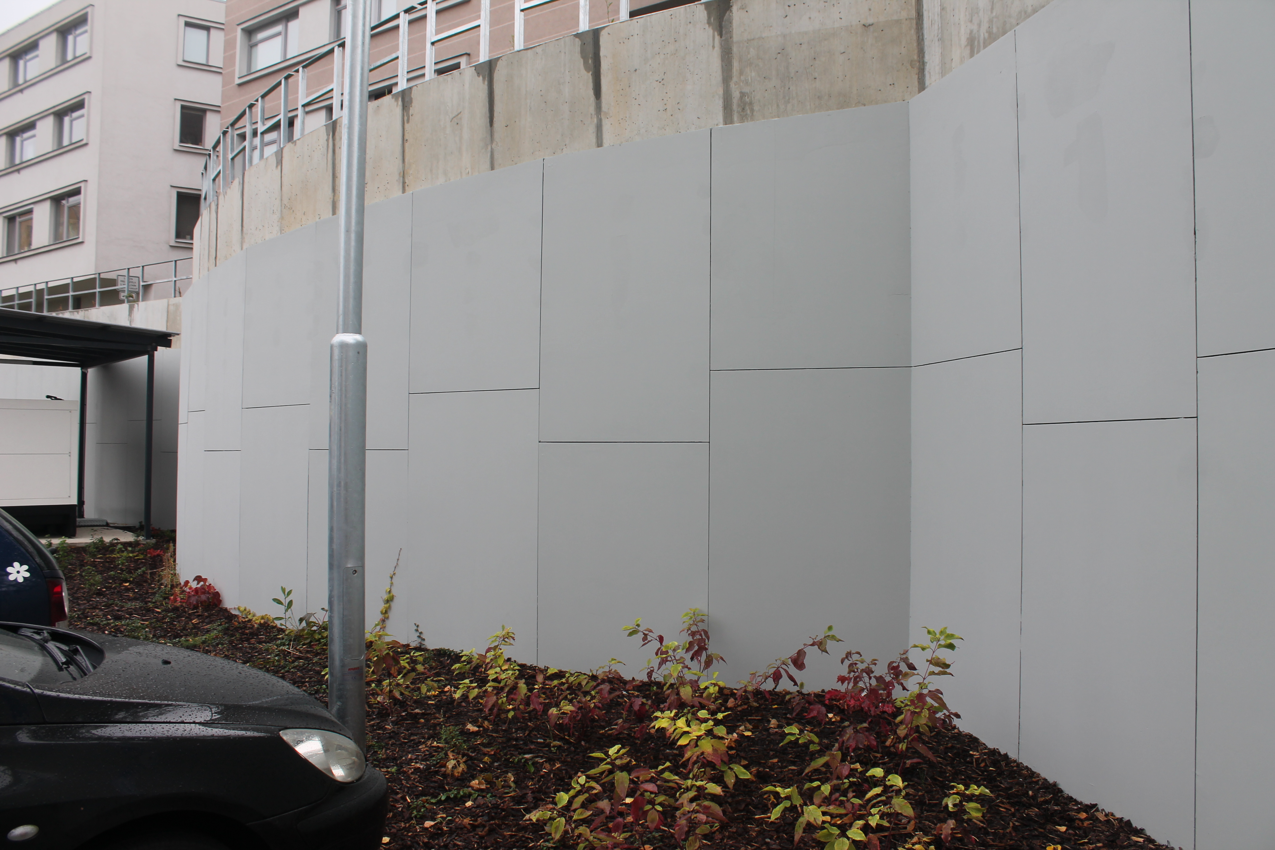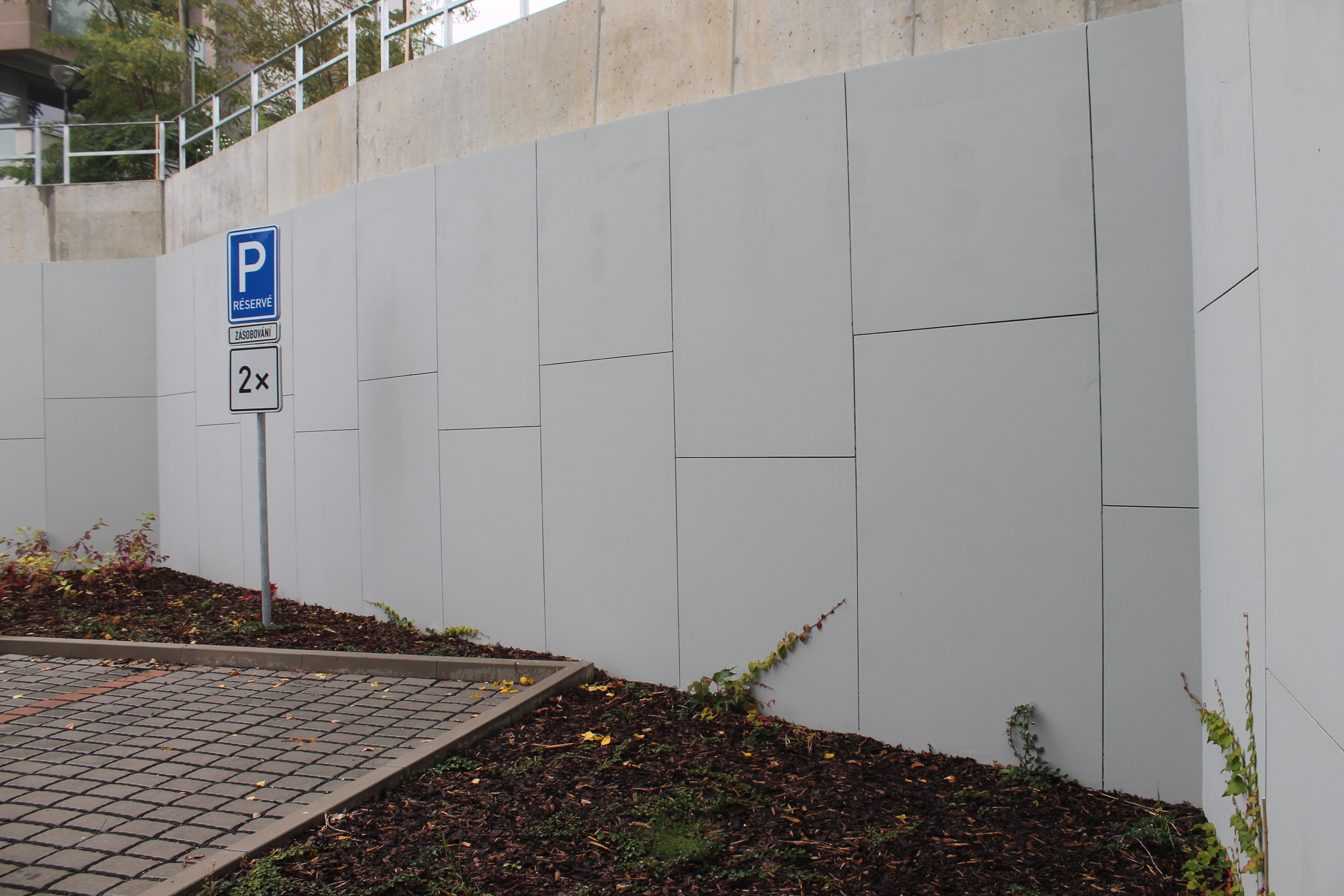 Vnější část opěrné zdi v zadní části nové budovy tvoří obklad z