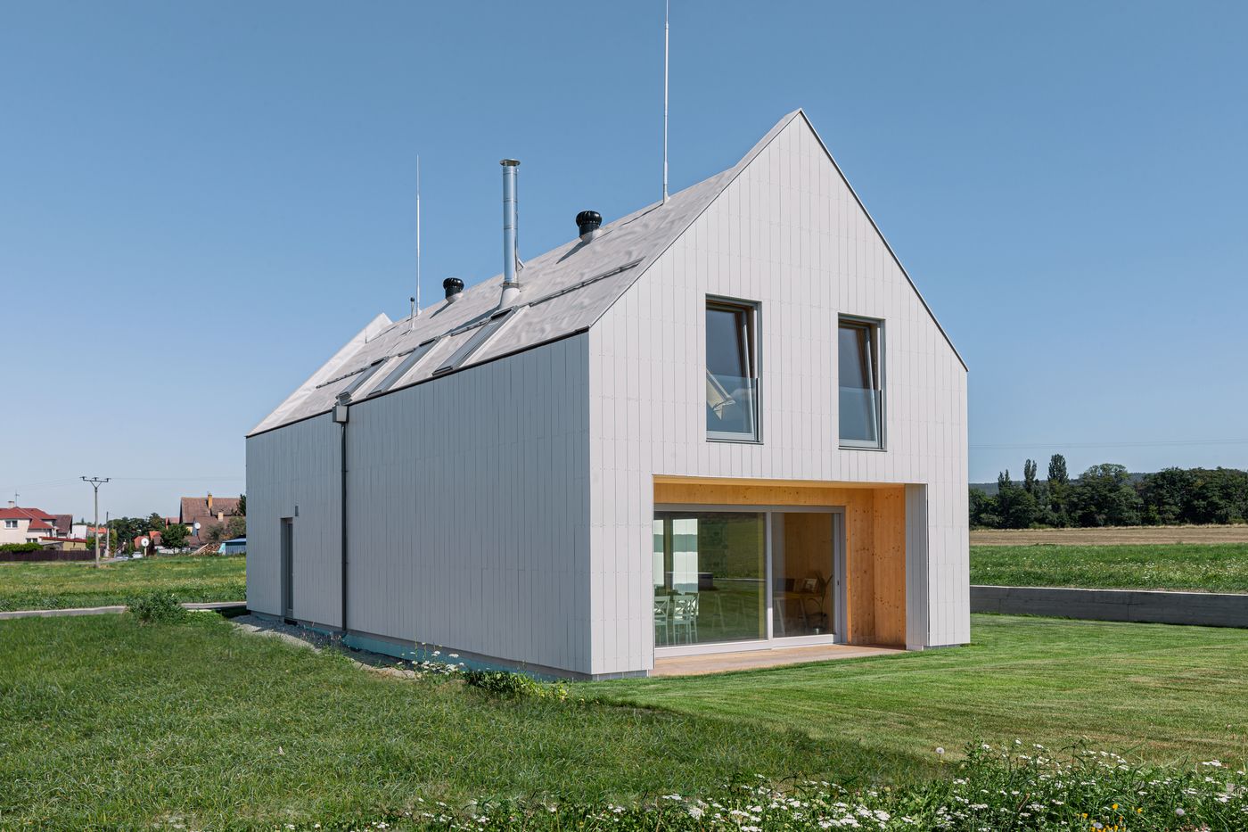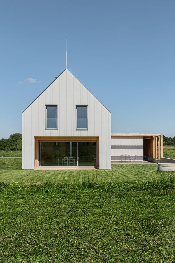 Dvoupodlažní dřevostavba je postavena z CLT panelů Novatop, fasáda a střecha jsou provětrávané, izolované přírodním dřevovláknem. Výsledkem je nízkoenergetický dům v energetické třídě A s velmi nízkými provozními náklady z udržitelných ekologických materiálů. Takovými jsou i vláknocementové obklady Hardie® Plank v bílé a šedé (odstín mlhově šedá) barvě, při jejichž instalaci byly použity různé druhy kotvení. Kombinace bílého a šedého fasádního obkladu doplněná o prvky ze dřeva působí moderně, elegantně a zároveň útulně. Bílá barva rozjasňuje stavbu a opticky ji odlehčuje, šedá dodává hloubku, serióznost a zvýrazňuje architektonické linie, zatímco dřevo přináší přírodní teplo a harmonii. Společně vytvářejí vyvážený kontrast, který umí podtrhnout současnou architekturu, dodat domu dynamiku a zároveň mu ponechat přívětivý charakter, blízký přírodě.