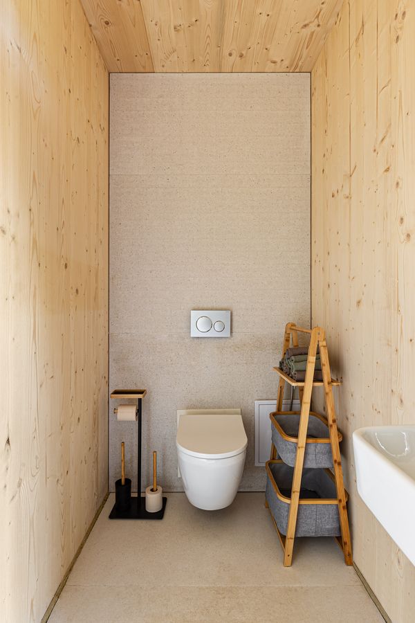 Díky velkým proskleným plochám a posuvným portálům se dům přirozeně otevírá do zahrady, která plynule přechází do okolní přírody. Dvě prostorné terasy nabízejí ideální prostor pro relaxaci, grilování nebo ranní kávu s výhledem do zeleně. Součástí pozemku je i krytý přístřešek pro dvě auta s přípravou na nabíječku pro elektromobil a s integrovanou kolnou třeba na zahradní nářadí či zimní kola od aut.